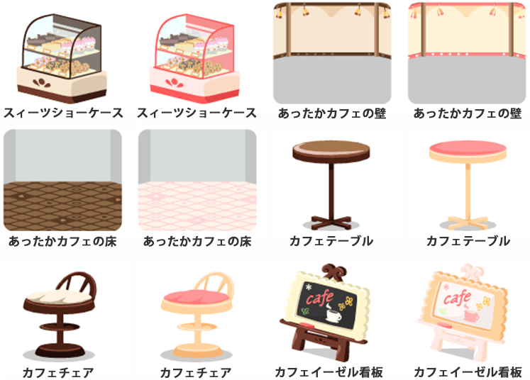 スィーツショーケース スィーツショーケース あったかカフェの壁 あったかカフェの壁 あったかカフェの床 あったかカフェの床 カフェテーブル カフェテーブル カフェチェア カフェチェア カフェイーゼル看板 カフェイーゼル看板 カフェランプ カフェランプ カウンターパーツ/四角 カウンターパーツ/四角 カウンターパーツ/角丸 カウンターパーツ/角丸 カフェパーテーション カフェパーテーション あったかティーセット あったかティーセット