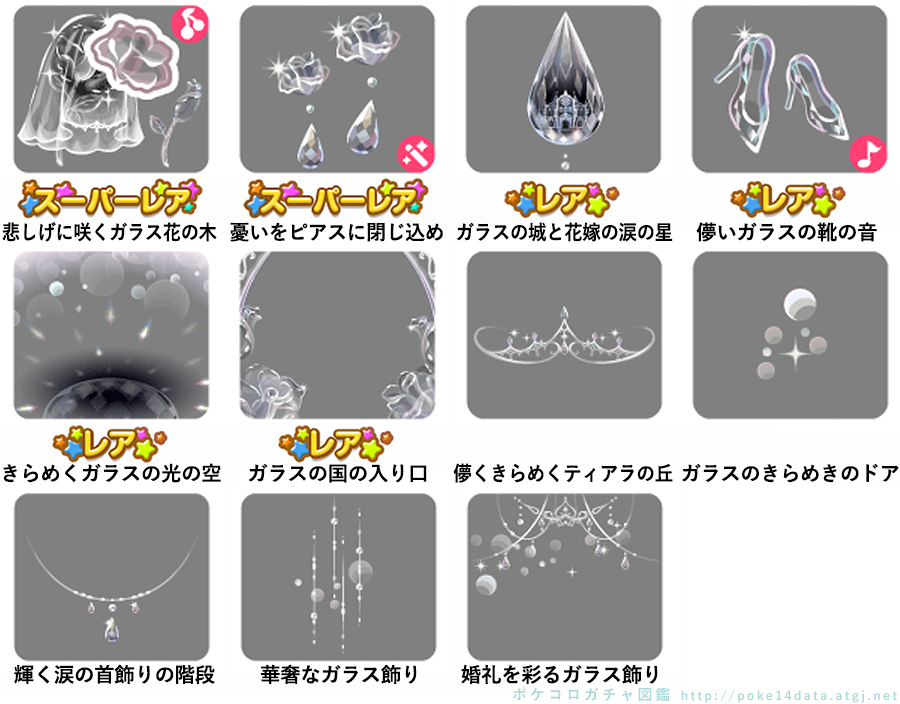 ★悲しげに咲くガラス花の木 No.1394 きらめくガラス花ゼリー 悲しげなガラス花の実 No.1395 ★きらめくガラス花ゼリー ★悲しげなガラス花の実 ★憂いをピアスに閉じ込め(フィルターアイテム) ☆ガラスの城と花嫁の涙の星 ☆儚いガラスの靴の音(Cネイロアイテム) ☆きらめくガラスの光の空 ☆ガラスの国の入り口 儚くきらめくティアラの丘 ガラスのきらめきのドア 輝く涙の首飾りの階段 華奢なガラス飾り 婚礼を彩るガラス飾り