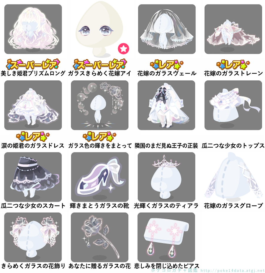 ★美しき姫君プリズムロング ★ガラスきらめく花嫁アイ(顔パーツ) ☆花嫁のガラスヴェール ☆花嫁のガラストレーン ☆涙の姫君のガラスドレス ☆ガラス色の輝きをまとって 隣国のまだ見ぬ王子の正装 瓜二つな少女のトップス 瓜二つな少女のスカート 輝きまとうガラスの靴 光輝くガラスのティアラ 花嫁のガラスグローブ きらめくガラスの花飾り あなたに贈るガラスの花 悲しみを閉じ込めたピアス