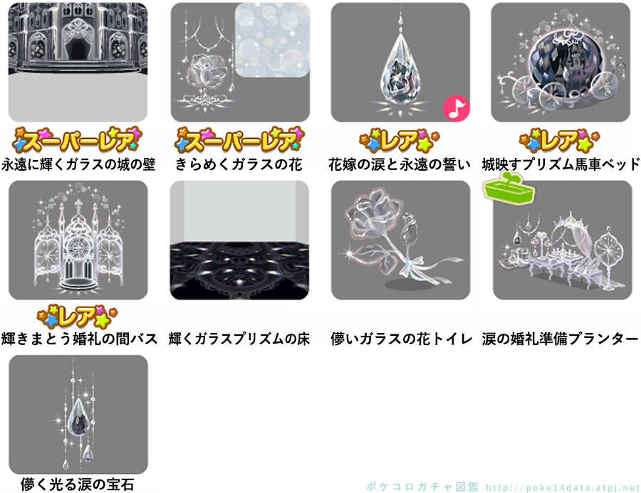 ★永遠に輝くガラスの城の壁 ★きらめくガラスの花(パターンアイテム) ☆花嫁の涙と永遠の誓い(ネイロアイテム) ☆城映すプリズム馬車ベッド ☆輝きまとう婚礼の間バス 輝くガラスプリズムの床 儚いガラスの花トイレ 涙の婚礼準備プランター 儚く光る涙の宝石