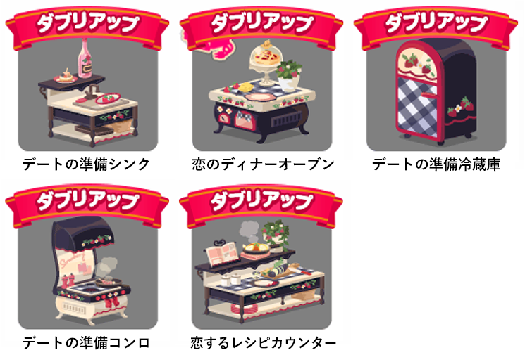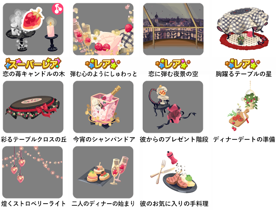 デートの準備シンク お気に入りミトン③ 彼のプレゼントパンプス③ 恋のディナーオーブン 苺のループピアス③ 彼の大好物♥苺パイ③ デートの準備冷蔵庫 甘いデザートで一息トイレ③ ディナーの準備プランター③ デートの準備コンロ 二人のディナーの始まり③ 彼のお気に入りの手料理③ 恋するレシピカウンター 今宵のシャンパンドア③ ディナーデートの準備③