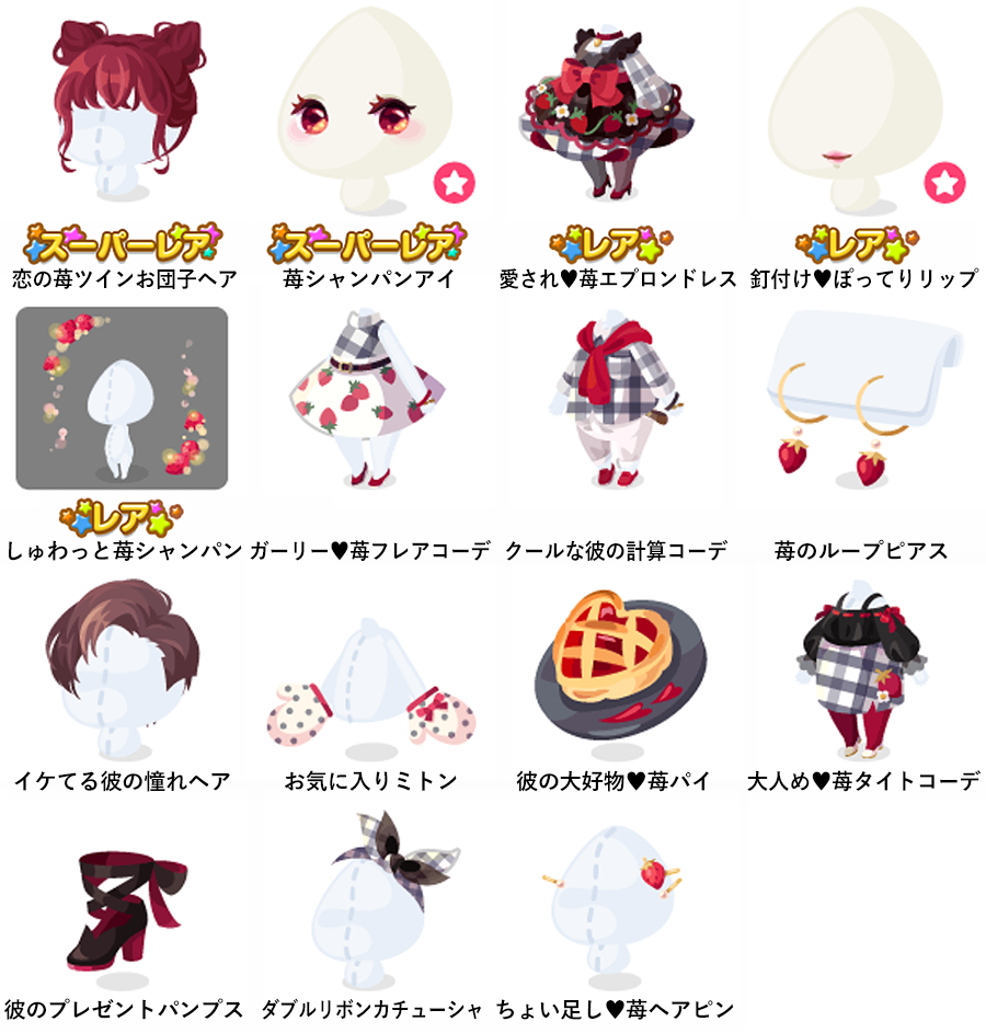 ★恋の苺ツインお団子ヘア ★苺シャンパンアイ(顔パーツ) ☆愛され♥苺エプロンドレス ☆釘付け♥ぽってりリップ(顔パーツ) ☆しゅわっと苺シャンパン ガーリー♥苺フレアコーデ クールな彼の計算コーデ 苺のループピアス イケてる彼の憧れヘア お気に入りミトン 彼の大好物♥苺パイ 大人め♥苺タイトコーデ 彼のプレゼントパンプス ダブルリボンカチューシャ ちょい足し♥苺ヘアピン