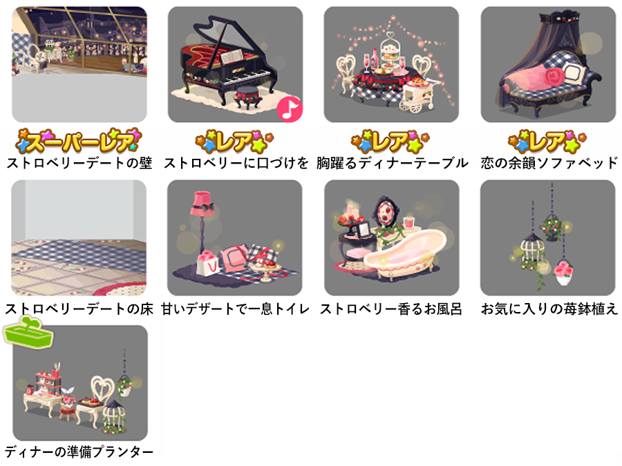 ★ストロベリーデートの壁 ☆ストロベリーに口づけを(ネイロアイテム) ☆胸躍るディナーテーブル ☆恋の余韻ソファベッド ストロベリーデートの床 甘いデザートで一息トイレ ストロベリー香るお風呂 お気に入りの苺鉢植え ディナーの準備プランター