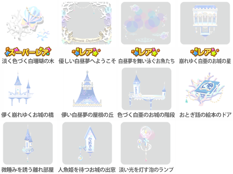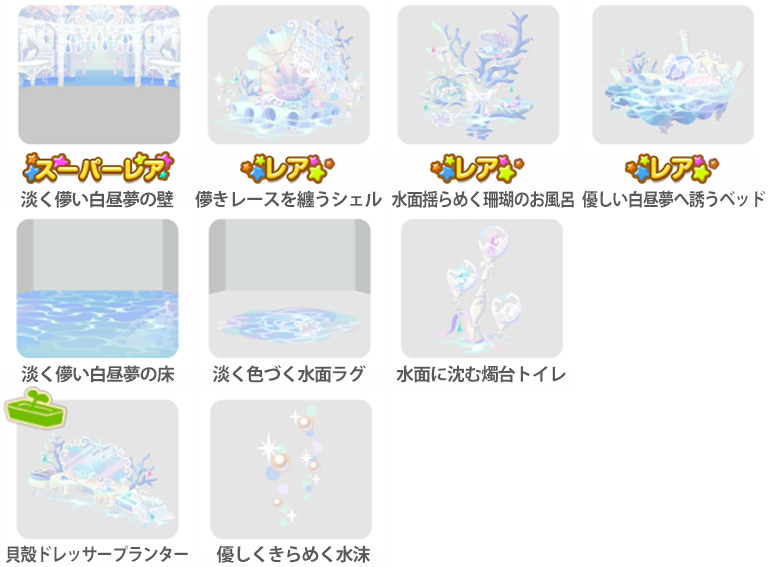 ★淡く儚い白昼夢の壁 ☆儚きレースを纏うシェル ☆水面揺らめく珊瑚のお風呂 ☆優しい白昼夢へ誘うベッド 淡く儚い白昼夢の床 淡く色づく水面ラグ 水面に沈む燭台トイレ 貝殻ドレッサープランター 優しくきらめく水沫