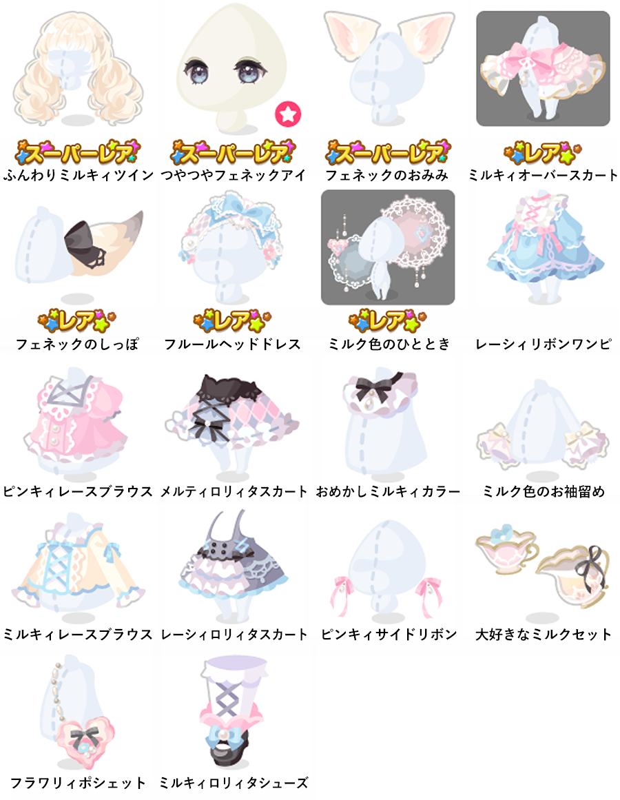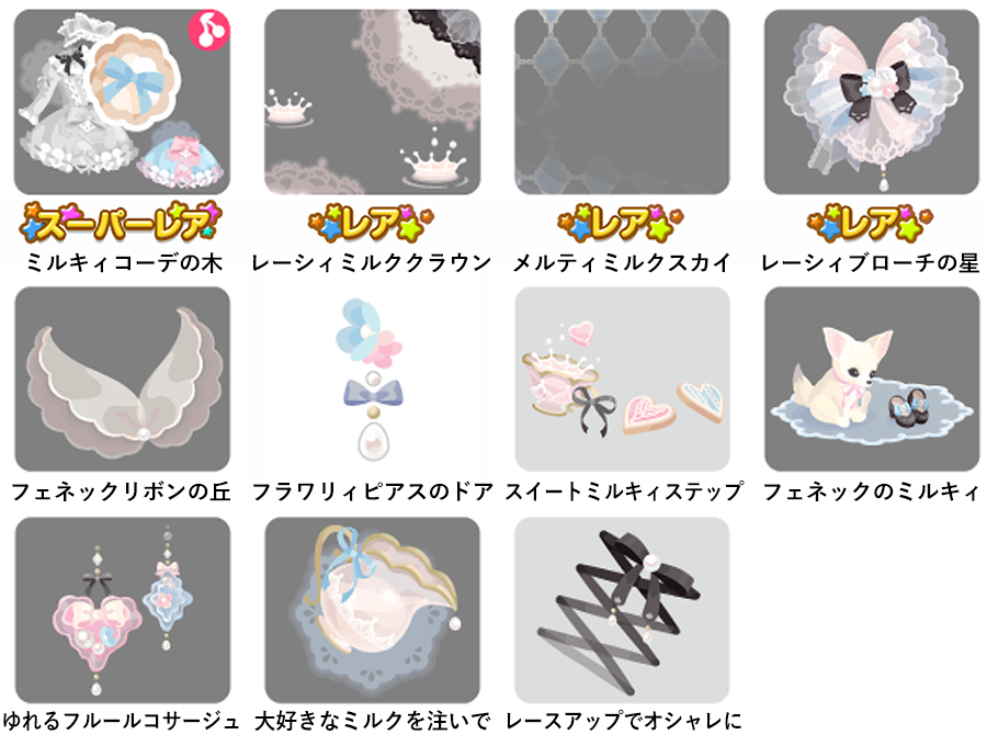 ★ミルキィコーデの木 No.1179 メルティミルク ミルキィスイーツの実 No.1180 輝くメルティミルク 煌くミルキィスイーツの実 ☆レーシィミルククラウン ☆メルティミルクスカイ ☆レーシィブローチの星 フェネックリボンの丘 フラワリィピアスのドア スイートミルキィステップ フェネックのミルキィ ゆれるフルールコサージュ 大好きなミルクを注いで レースアップでオシャレに