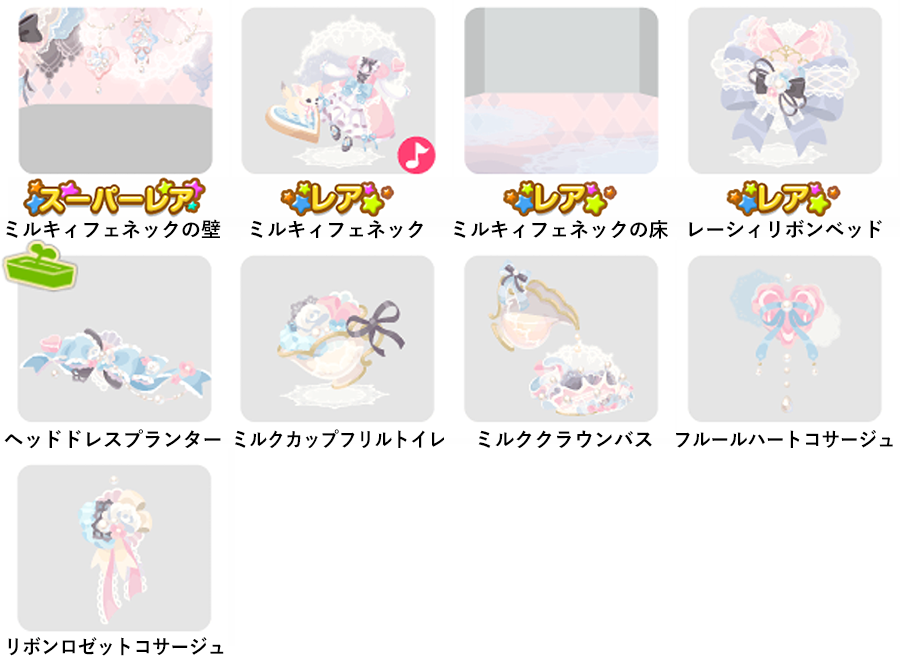 ★ミルキィフェネックの壁 ☆ミルキィフェネック(ネイロアイテム) ☆ミルキィフェネックの床 ☆レーシィリボンベッド ヘッドドレスプランター ミルクカップフリルトイレ ミルククラウンバス フルールハートコサージュ リボンロゼットコサージュ