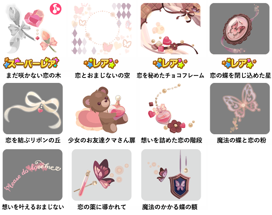 ★まだ咲かない恋の木 No.1117 恋の秘密ジュレ 恋の秘密の実 No.1118 きらめく恋の秘密ジュレ きらめく恋の秘密の実(レアな実) ☆恋とおまじないの空 ☆恋を秘めたチョコフレーム ☆恋の蝶を閉じ込めた星 恋を結ぶリボンの丘 少女のお友達クマさん扉 想いを詰めた恋の階段 魔法の蝶と恋の粉 想いを叶えるおまじない 恋の薬に導かれて 魔法のかかる蝶の額