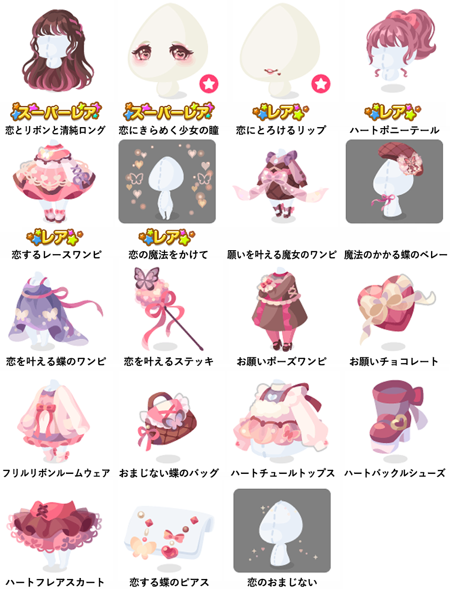 ★恋とリボンと清純ロング ★恋にきらめく少女の瞳(顔パーツ) ☆恋にとろけるリップ(顔パーツ) ☆ハートポニーテール ☆恋するレースワンピ ☆恋の魔法をかけて 願いを叶える魔女のワンピ 魔法のかかる蝶のベレー 恋を叶える蝶のワンピ 恋を叶えるステッキ お願いポーズワンピ お願いチョコレート フリルリボンルームウェア おまじない蝶のバッグ ハートチュールトップス ハートバックルシューズ ハートフレアスカート 恋する蝶のピアス 恋のおまじない