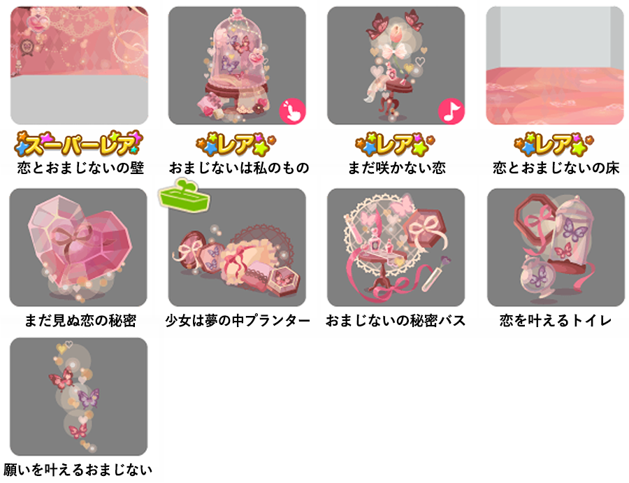 ★恋とおまじないの壁 ☆おまじないは私のもの(アクションアイテム) ☆まだ咲かない恋(ネイロアイテム) ☆恋とおまじないの床 まだ見ぬ恋の秘密 少女は夢の中プランター おまじないの秘密バス 恋を叶えるトイレ 願いを叶えるおまじない