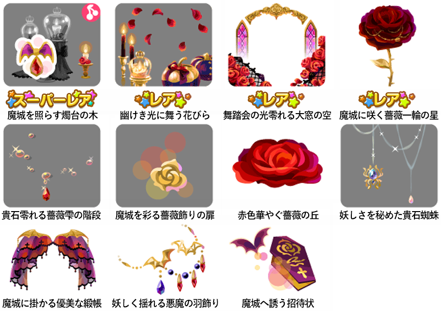 ★魔城を照らす燭台の木 No.1061 芳しの赤薔薇パルフェ 魔城を彩る貴石の実 No.1062 美しの金薔薇パルフェ 魔城を彩る金色貴石の実(レアな実) ☆幽けき光に舞う花びら ☆舞踏会の光零れる大窓の空 ☆魔城に咲く薔薇一輪の星 貴石零れる薔薇雫の階段 魔城を彩る薔薇飾りの扉 赤色華やぐ薔薇の丘 妖しさを秘めた貴石蜘蛛 魔城に掛かる優美な緞帳 妖しく揺れる悪魔の羽飾り 魔城へ誘う招待状