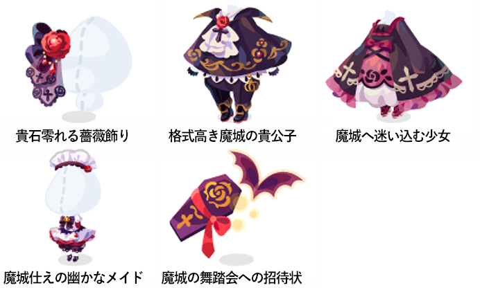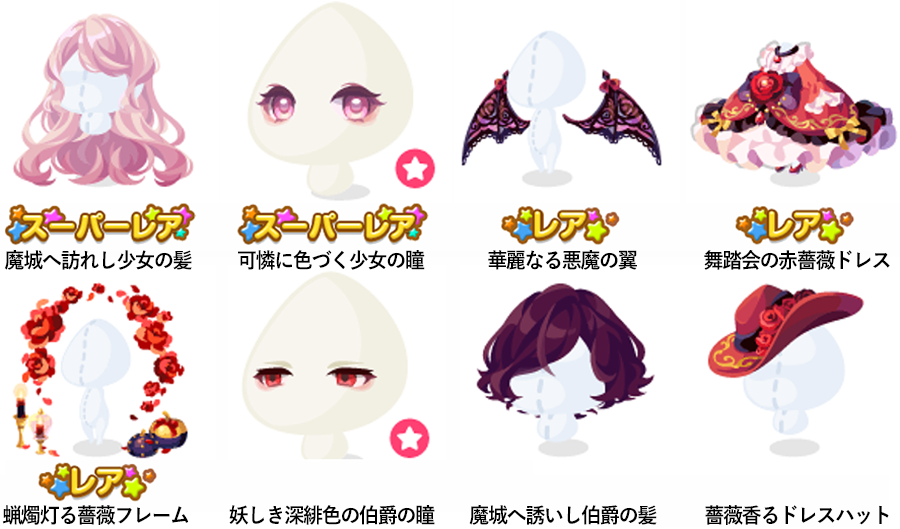 ★魔城へ訪れし少女の髪 ★可憐に色づく少女の瞳(顔パーツ) ☆華麗なる悪魔の翼 ☆舞踏会の赤薔薇ドレス ☆蝋燭灯る薔薇フレーム 妖しき深緋色の伯爵の瞳(顔パーツ) 魔城へ誘いし伯爵の髪 薔薇香るドレスハット 貴石零れる薔薇飾り 格式高き魔城の貴公子 魔城へ迷い込む少女 魔城仕えの幽かなメイド 魔城の舞踏会への招待状