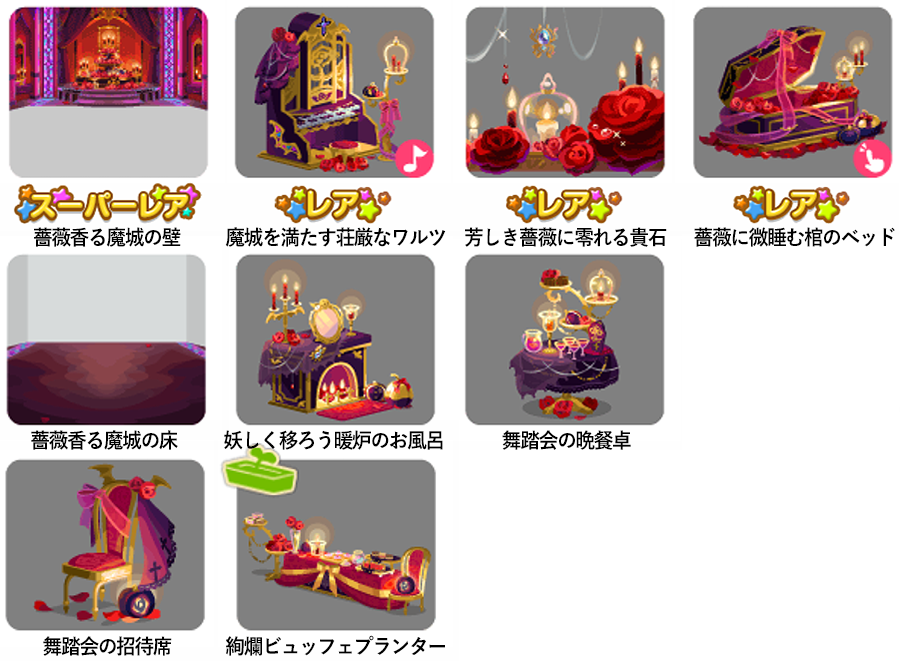 ★薔薇香る魔城の壁 ☆魔城を満たす荘厳なワルツ(ネイロアイテム) ☆芳しき薔薇に零れる貴石 ☆薔薇に微睡む棺のベッド(アクションアイテム) 薔薇香る魔城の床 妖しく移ろう暖炉のお風呂 舞踏会の晩餐卓 舞踏会の招待席 絢爛ビュッフェプランター