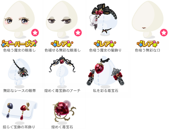 ★色吸う魔女の眼差し(顔パーツ) ☆色褪せる無彩な眼差し(顔パーツ) ☆色吸う魔女の髪飾り ☆色吸う無彩な口(顔パーツ) 無彩なレースの眼帯 煌めく苺宝飾のアーチ 私を彩る苺宝石 揺らぐ宝飾の耳飾り 煌めく苺宝石