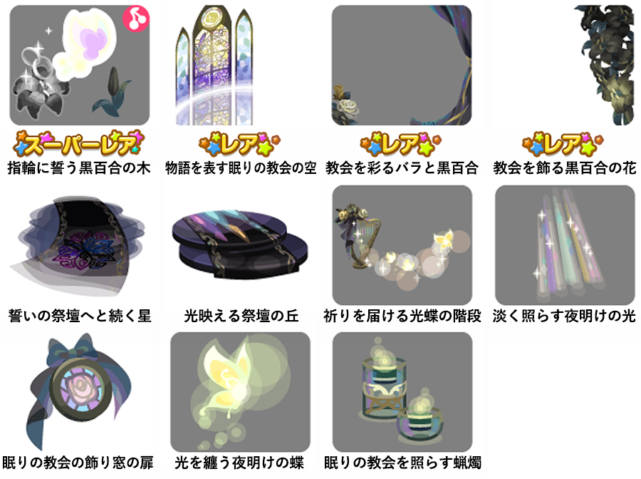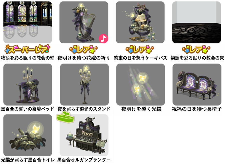 ★物語を彩る眠りの教会の壁 ☆夜明けを待つ花嫁の祈り(ネイロアイテム) ☆約束の日を想うケーキバス ☆物語を彩る眠りの教会の床 黒百合の誓いの祭壇ベッド 夜を照らす淡光のスタンド 夜明けを導く光蝶 祝福の日を待つ長椅子 光蝶が照らす黒百合トイレ 黒百合オルガンプランター