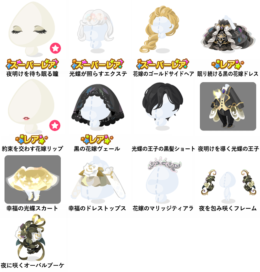 ★夜明けを待ち眠る瞳(顔パーツ) ★光蝶が照らすエクステ ★花嫁のゴールドサイドヘア ☆眠り続ける黒の花嫁ドレス ☆約束を交わす花嫁リップ(顔パーツ) ☆黒の花嫁ヴェール 光蝶の王子の黒髪ショート 夜明けを導く光蝶の王子 幸福の光蝶スカート 幸福のドレストップス 花嫁のマリッジティアラ 夜を包み咲くフレーム 夜に咲くオーバルブーケ