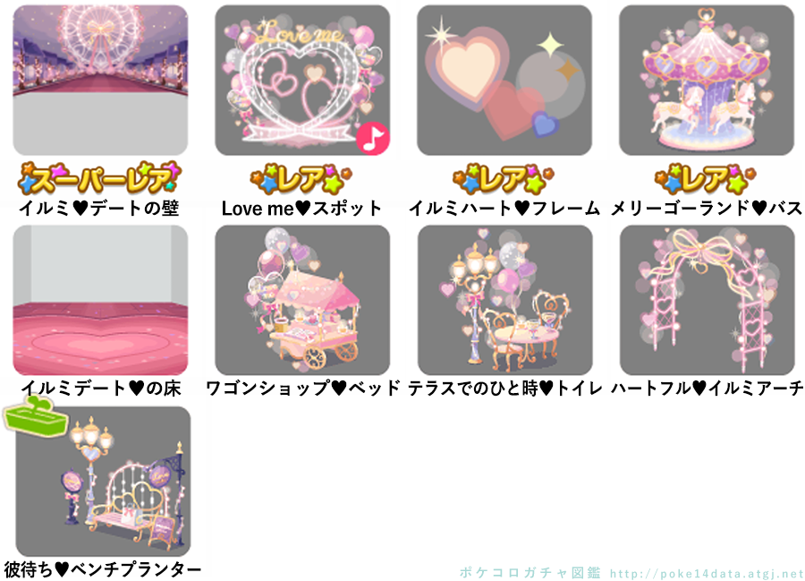 ★イルミ♥デートの壁 ☆Love me♥スポット(ネイロアイテム) ☆イルミハート♥フレーム ☆メリーゴーランド♥バス イルミデート♥の床 ワゴンショップ♥ベッド テラスでのひと時♥トイレ ハートフル♥イルミアーチ 彼待ち♥ベンチプランター