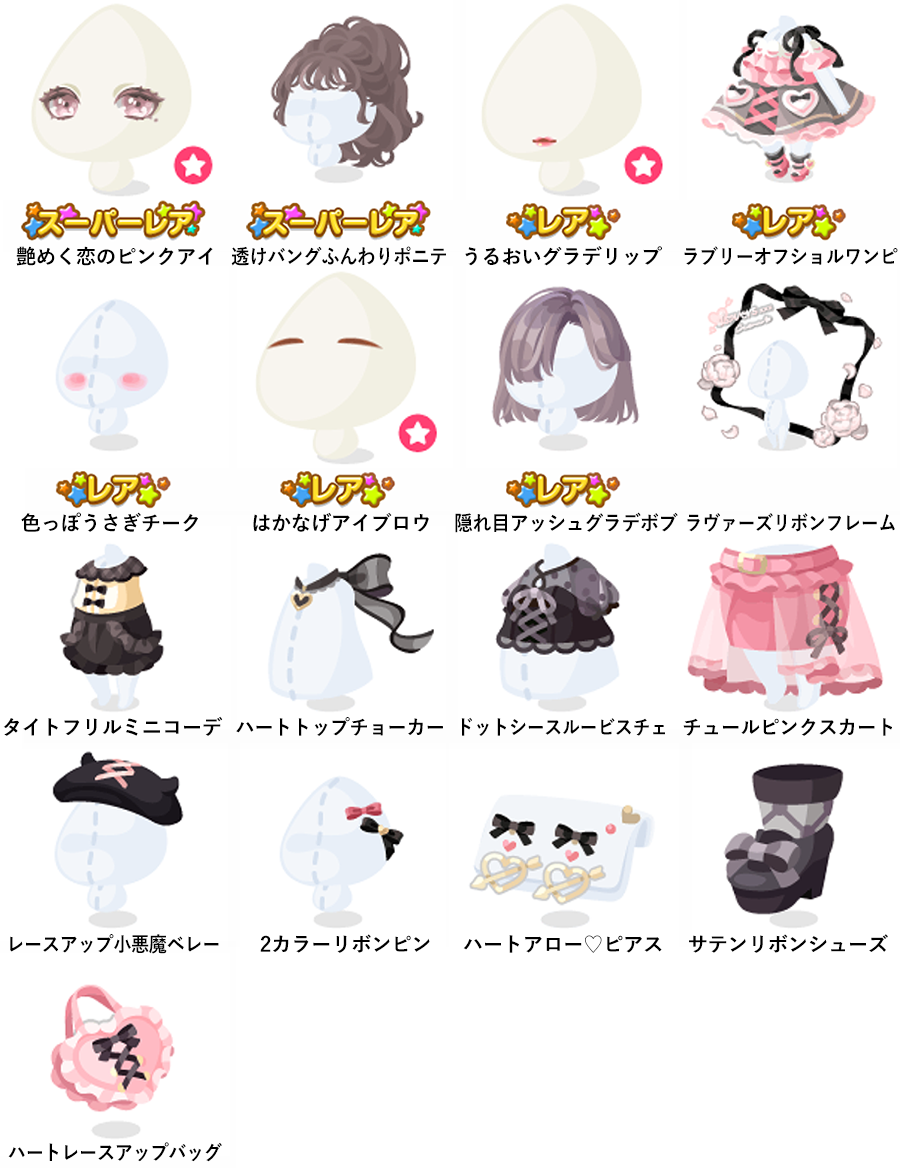 ★艶めく恋のピンクアイ(顔パーツ) ★透けバングふんわりポニテ ☆うるおいグラデリップ(顔パーツ) ☆ラブリーオフショルワンピ ☆色っぽうさぎチーク ☆はかなげアイブロウ(顔パーツ) ☆隠れ目アッシュグラデボブ ラヴァーズリボンフレーム タイトフリルミニコーデ ハートトップチョーカー ドットシースルービスチェ チュールピンクスカート レースアップ小悪魔ベレー 2カラーリボンピン ハートアロー♡ピアス サテンリボンシューズ ハートレースアップバッグ