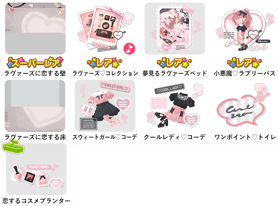 ★ラヴァーズに恋する壁 ☆ラヴァーズ♡コレクション(ネイロアイテム) ☆夢見るラヴァーズベッド ☆小悪魔♡ラブリーバス ラヴァーズに恋する床 スウィートガール♡コーデ クールレディ♡コーデ ワンポイント♡トイレ 恋するコスメプランター