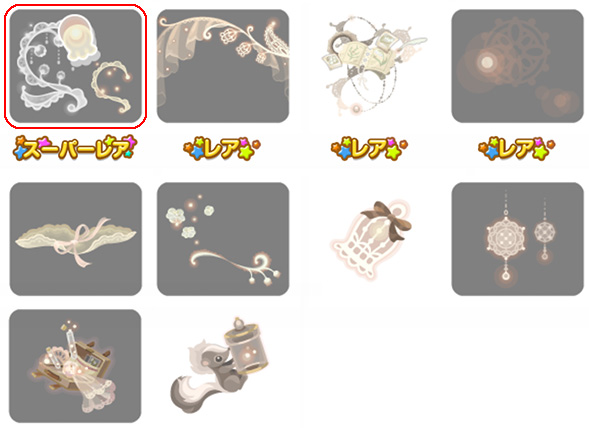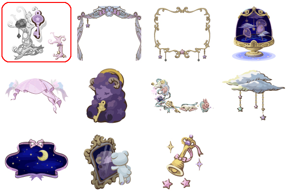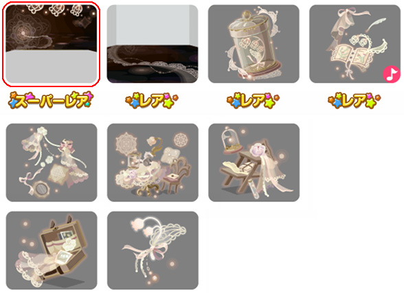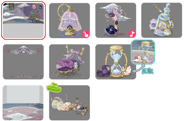 ★ゆめにとけてくお部屋の壁 ☆あなたのためのゆめ物語(アクションアイテム) ☆歌いつづけるゆめみの木(ネイロアイテム) ☆おやすみシロップのお風呂 さめないゆめの物語 ゆめへのいりぐちベッド あまい砂糖の砂時計 ゆめへの招待状の床 お気にいりのたからもの