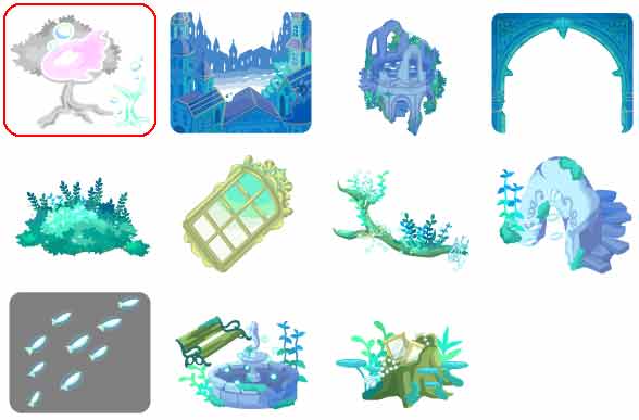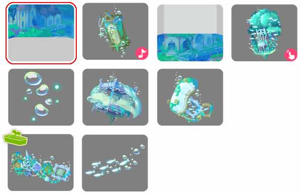 ★水底の都の壁 ☆誰も知らない水の底(ネイロアイテム) ☆水底の都の床 ☆小魚と戯れる追想の場所(アクションアイテム) 昇り消えゆく水底の泡 置き去りにされた都の寝具 忘れさられた都のお風呂 誰かの遺したプランター 泡となり消えゆく魚の群れ