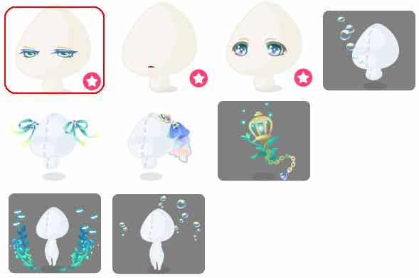 ★憂いを秘めた少女の瞳(顔パーツ) ☆噤まれた口(顔パーツ) ☆水底を望む少年の瞳(顔パーツ) ☆水面へと消えゆく泡 たゆたう少女の二つリボン 水底の魚の髪飾り 都を照らす淡い光 水底を彩る魚と水草 水底の都から昇る泡