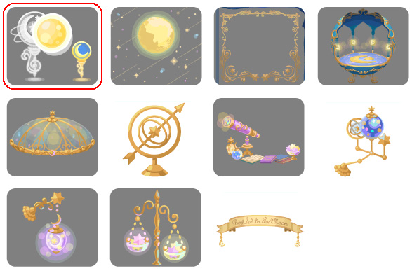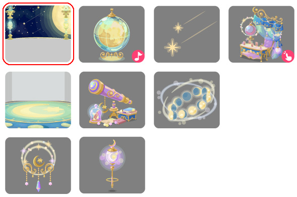 ★ルナホロスコープの壁 ☆ルナスピリトゥスの天球儀(ネイロアイテム) ☆月を呼ぶ流星群 ☆月の占い師の机(アクションアイテム) ルナホロスコープの床 望遠鏡の予見お風呂 朔望を示すベッド 運命を紡ぐペンデュラム 月光のランプトイレ
