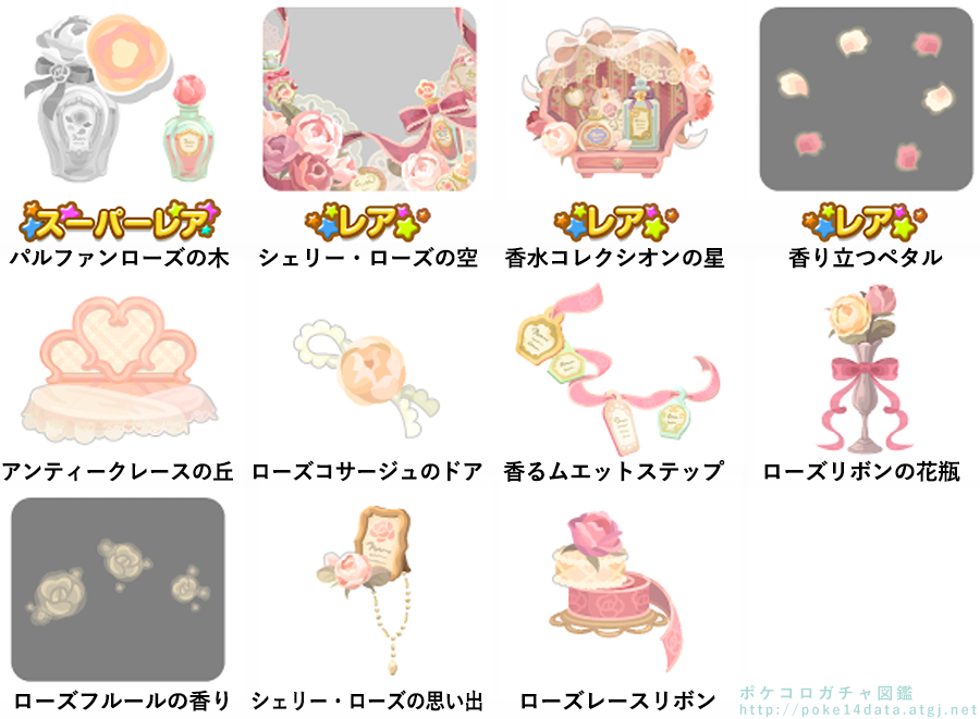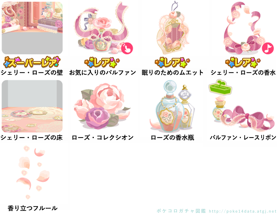 ★シェリー・ローズの壁 ☆お気に入りのパルファン(アクションアイテム) ☆眠りのためのムエット ☆シェリー・ローズの香水(ネイロアイテム) シェリー・ローズの床 ローズ・コレクシオン ローズの香水瓶 パルファン・レースリボン 香り立つフルール