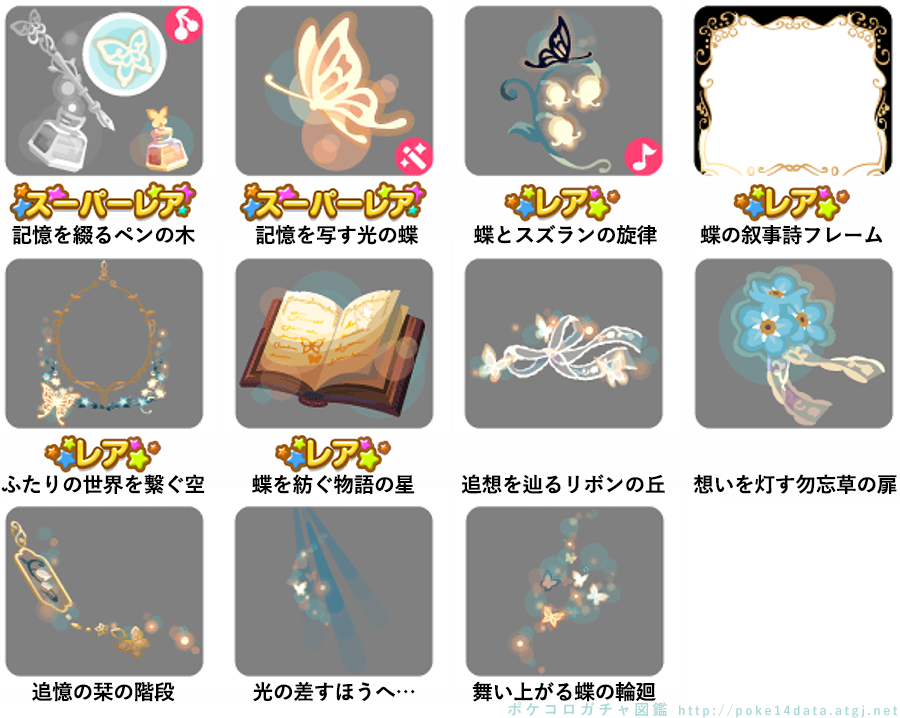 ★記憶を綴るペンの木 No.1378 たゆたう光の記憶ソーダ 記憶の蝶の実 No.1379 ★たゆたう光の記憶ソーダ ★記憶の蝶の実 ★記憶を写す光の蝶(フィルターアイテム) ☆蝶とスズランの旋律(Cネイロアイテム) ☆蝶の叙事詩フレーム ☆ふたりの世界を繋ぐ空 ☆蝶を紡ぐ物語の星 追想を辿るリボンの丘 想いを灯す勿忘草の扉 追憶の栞の階段 光の差すほうへ… 舞い上がる蝶の輪廻