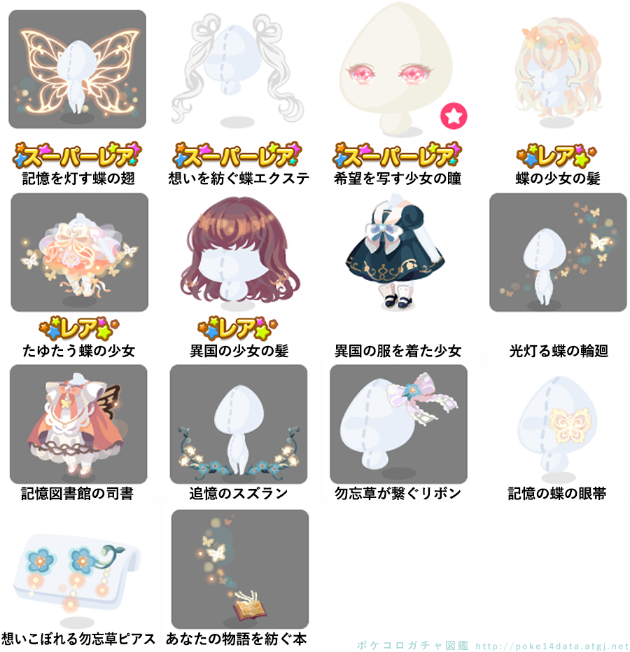 ★記憶を灯す蝶の翅 ★想いを紡ぐ蝶エクステ ★希望を写す少女の瞳(顔パーツ) ☆蝶の少女の髪 ☆たゆたう蝶の少女(アクション付きfアイテム) ☆異国の少女の髪 異国の服を着た少女 光灯る蝶の輪廻 記憶図書館の司書 追憶のスズラン 勿忘草が繋ぐリボン 記憶の蝶の眼帯 想いこぼれる勿忘草ピアス あなたの物語を紡ぐ本