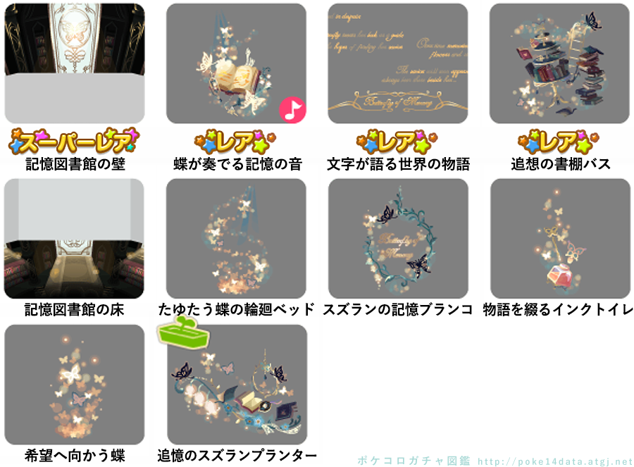 ★記憶図書館の壁 ☆蝶が奏でる記憶の音(ネイロアイテム) ☆文字が語る世界の物語 ☆追想の書棚バス 記憶図書館の床 たゆたう蝶の輪廻ベッド スズランの記憶ブランコ 物語を綴るインクトイレ 希望へ向かう蝶 追憶のスズランプランター
