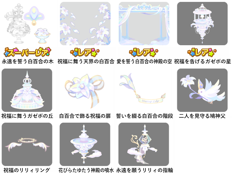 ★永遠を誓う白百合の木 No.1189 祝福のリリィケーキ 誓いの白百合の実 ☆祝福に舞う天界の白百合 ☆愛を誓う白百合の神殿の空 ☆祝福を告げるガゼボの星 祝福に舞うガゼボの丘 白百合で飾る祝福の扉 誓いを綴る白百合の階段 二人を見守る鳩神父 祝福のリリィリング 花びらたゆたう神殿の噴水 永遠を願うリリィの指輪