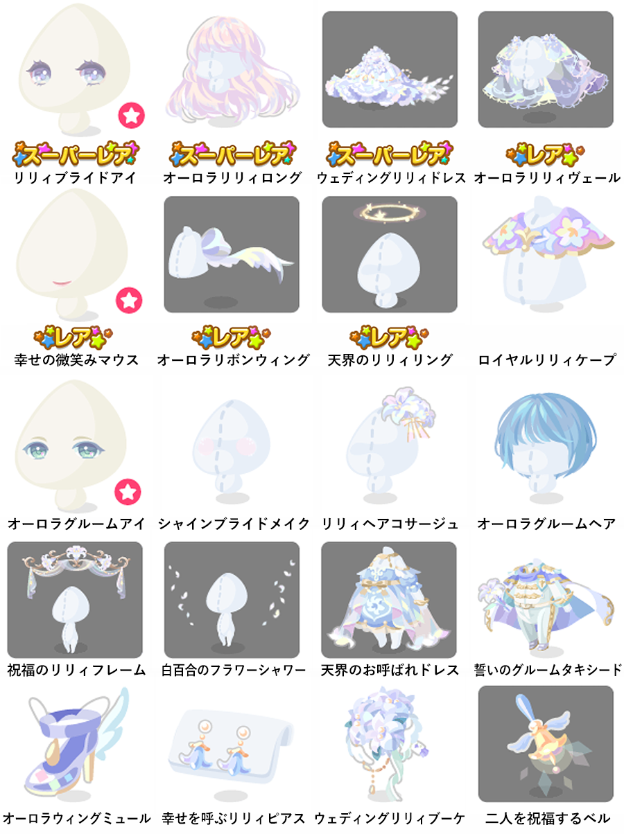 ★リリィブライドアイ(顔パーツ) ★オーロラリリィロング ★ウェディングリリィドレス(アクション付きfアイテム) ☆オーロラリリィヴェール ☆幸せの微笑みマウス(顔パーツ) ☆オーロラリボンウィング ☆天界のリリィリング ロイヤルリリィケープ オーロラグルームアイ(顔パーツ) シャインブライドメイク リリィヘアコサージュ オーロラグルームヘア 祝福のリリィフレーム 白百合のフラワーシャワー 天界のお呼ばれドレス 誓いのグルームタキシード オーロラウィングミュール 幸せを呼ぶリリィピアス ウェディングリリィブーケ 二人を祝福するベル