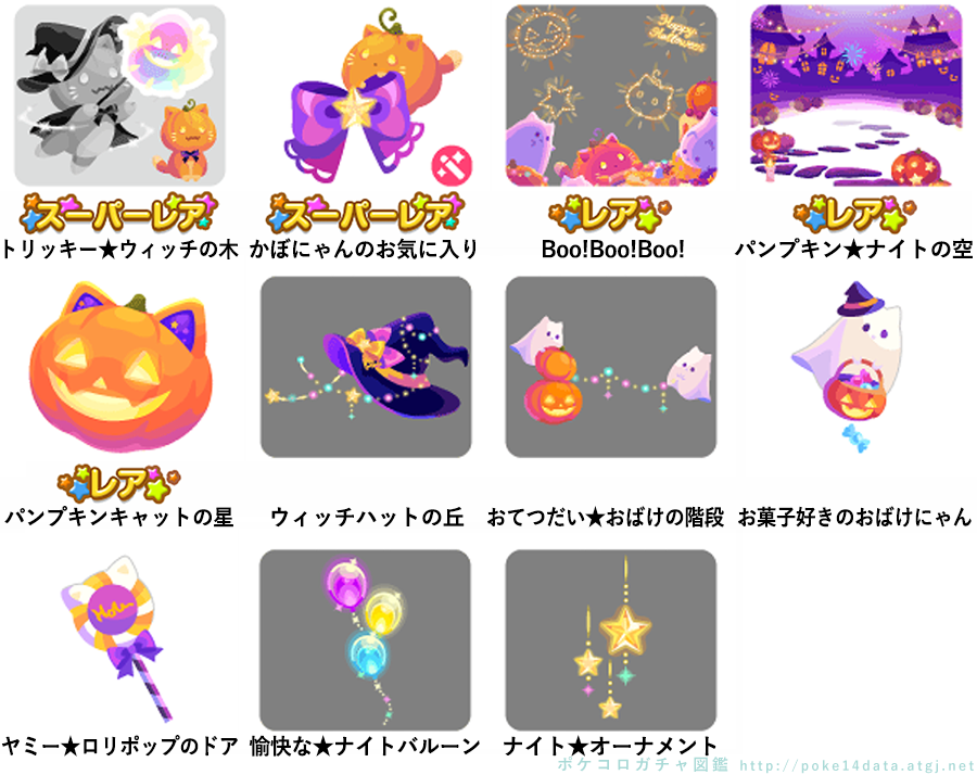 ★トリッキー★ウィッチの木 No.1450 ヤミー★パンプキンケーキ マジカル★パンプキンの実 ★かぼにゃんのお気に入り(フィルターアイテム) ☆Boo!Boo!Boo! ☆パンプキン★ナイトの空 ☆パンプキンキャットの星 ウィッチハットの丘 おてつだい★おばけの階段 お菓子好きのおばけにゃん ヤミー★ロリポップのドア 愉快な★ナイトバルーン ナイト★オーナメント