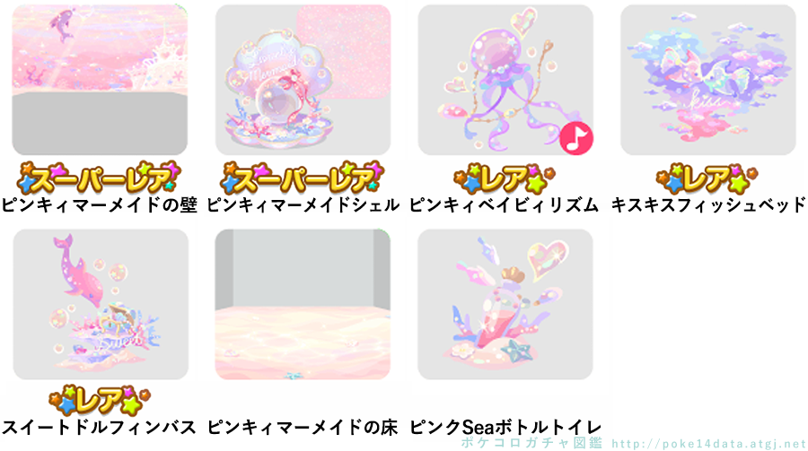 ★ピンキィマーメイドの壁 ★ピンキィマーメイドシェル(パターンアイテム) ☆ピンキィベイビィリズム(ネイロアイテム) ☆キスキスフィッシュベッド ☆スイートドルフィンバス ピンキィマーメイドの床 ピンクSeaボトルトイレ