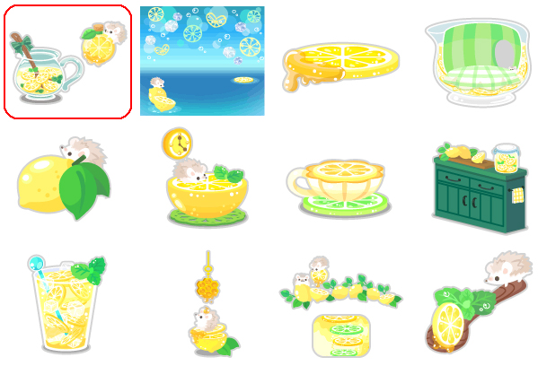 ★しあわせレモネードの木 さわやか氷とレモンの空 はちみつレモンの丘 たっぷりレモネードの星 とれたてレモンのステップ ハリネズミとレモンの机 とろとろレモンのカップ とれたてレモンのキッチン ひんやりレモネード はちみつ大好きハリネズミ ころころいっぱいレモン レモンとシーソー