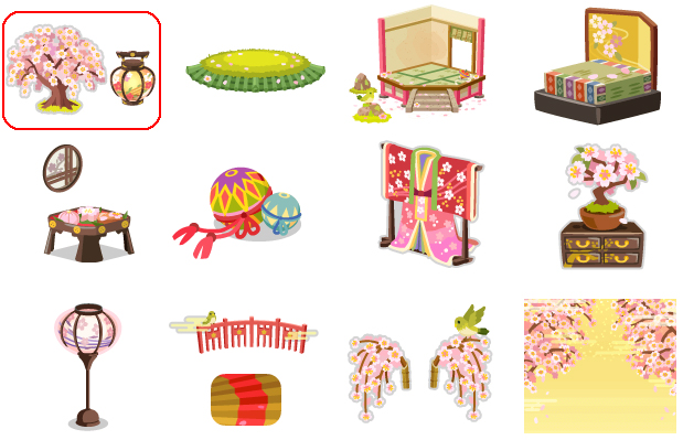 ★雅な桜の木 桜庭園の丘 桜庭園の星 桜屏風の小部屋ステップ おもてなし和菓子 雅な刺繍蹴鞠 姫君の春の装い 春を祝う盆栽 春待ちの灯籠 春告鳥と桜の階段 桜飾りと春告鳥 桜金屏風の空
