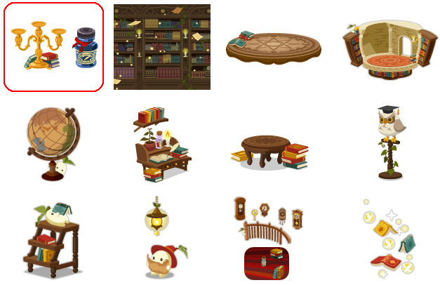 ★魔法使いの燭台 不思議な魔法図書館 魔法陣と本の丘 魔法図書館の星 不思議な古い地球儀 お勉強羽根ペン 魔法にかけられた椅子 見張り役のふくろう先生 読書家マンドレイク 魔法詠唱マンドレイク 図書館の螺旋階段 魔法の本の鳥