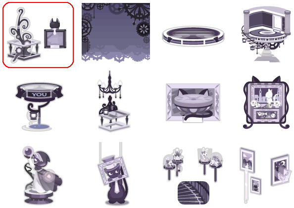 ★モノクロトリックツリー モノクロ歯車の空 大きな展示台 白黒アートな星 光を落とす展示台 トリックオブジェの机 猫なイスの絵画 夜景と白猫の名画 なぐさめの像 美術館の不思議な猫 モノクロオブジェ モノトーントロンプイユ