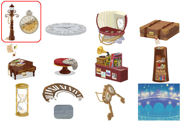 ★時を照らす街灯の木 刻まぬ時の丘 集約する時間 時間旅行のバッグ 日々を綴るデスク 歪む時の椅子 時を語る蓄音機 記録の格納 零れ落ちる時の砂 錆びゆく思い出 記憶の鍵 クロノ・ブリッジ