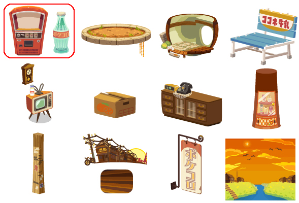 ★ポケ・コーラ販売木 レトロな空き地の丘 昭和レトロの星 黄昏ベンチ 最新型ブラウン管テレビ おみかんダンボール 懐かし黒電話 レトロなボトル棚 丈比べの思い出 昭和の町並み ポケコロ看板 夕焼け通り一丁目