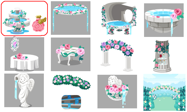 ★湧き出る泉のツリー 水鏡の丘 芳香たちこめる神殿 たゆたう水面のステップ 風にそよぐテーブル ローズチェア つるバラアーチ ローズチェスト 女神の彫刻 バラの垣根 天使の彫刻 ローズガーデン