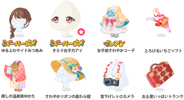 ★ゆるふわサイドみつあみ ★きらり女子力アイ(顔パーツ) ☆女子旅さわやかコーデ とろけるいちごソフト 癒しの温泉旅ゆかた さわやかリボンの麦わら帽 首下げレトロカメラ お土産いっぱいトランク