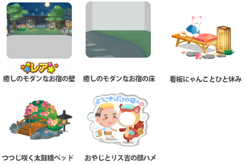 ☆癒しのモダンなお宿の壁 癒しのモダンなお宿の床 看板にゃんことひと休み つつじ咲く太鼓橋ベッド おやじとリス吉の顔ハメ