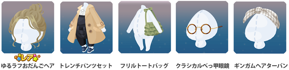 ☆ゆるラフおだんごヘア トレンチパンツセット フリルトートバッグ クラシカルべっ甲眼鏡 ギンガムヘアターバン