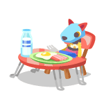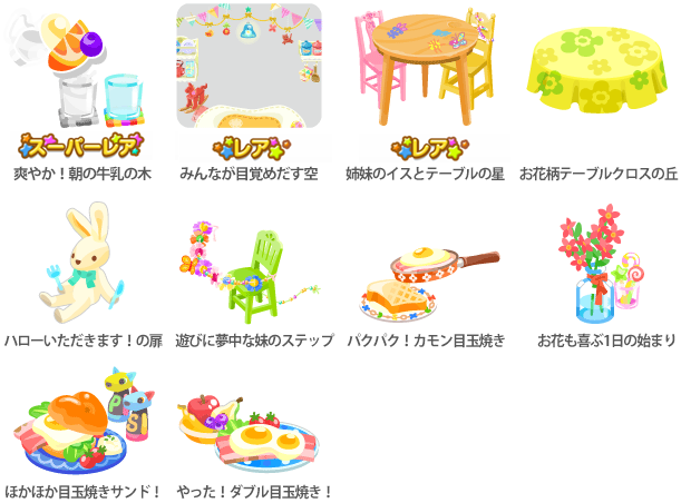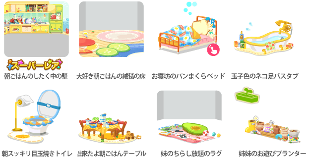 ★朝ごはんのしたく中の壁 大好き朝ごはんの絨毯の床 お寝坊のパンまくらベッド(アクションアイテム) 玉子色のネコ足バスタブ 朝スッキリ目玉焼きトイレ 出来たよ朝ごはんテーブル 妹のちらし放題のラグ 姉妹のお遊びプランター