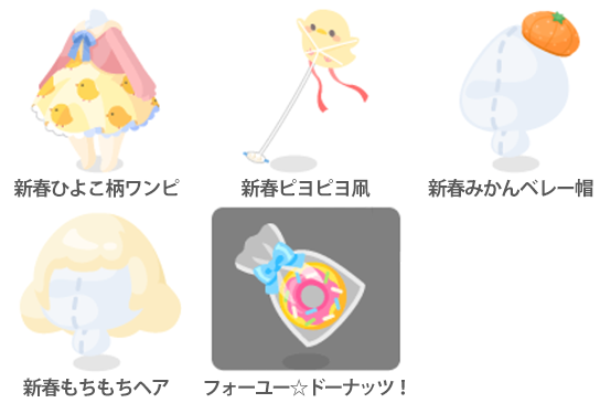 新春ひよこ柄ワンピ 新春ピヨピヨ凧 新春みかんベレー帽 新春もちもちヘア フォーユー☆ドーナッツ!