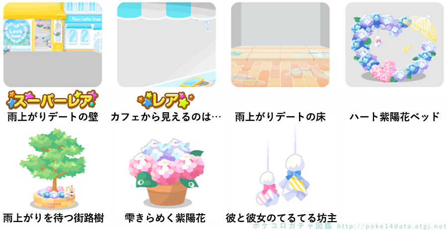 ★雨上がりデートの壁 ☆カフェから見えるのは… 雨上がりデートの床 ハート紫陽花ベッド 雨上がりを待つ街路樹 雫きらめく紫陽花 彼と彼女のてるてる坊主