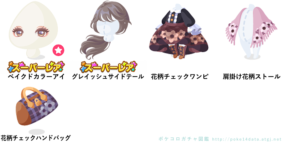 ★ベイクドカラーアイ(顔パーツ) ★グレイッシュサイドテール 花柄チェックワンピ 肩掛け花柄ストール 花柄チェックハンドバッグ
