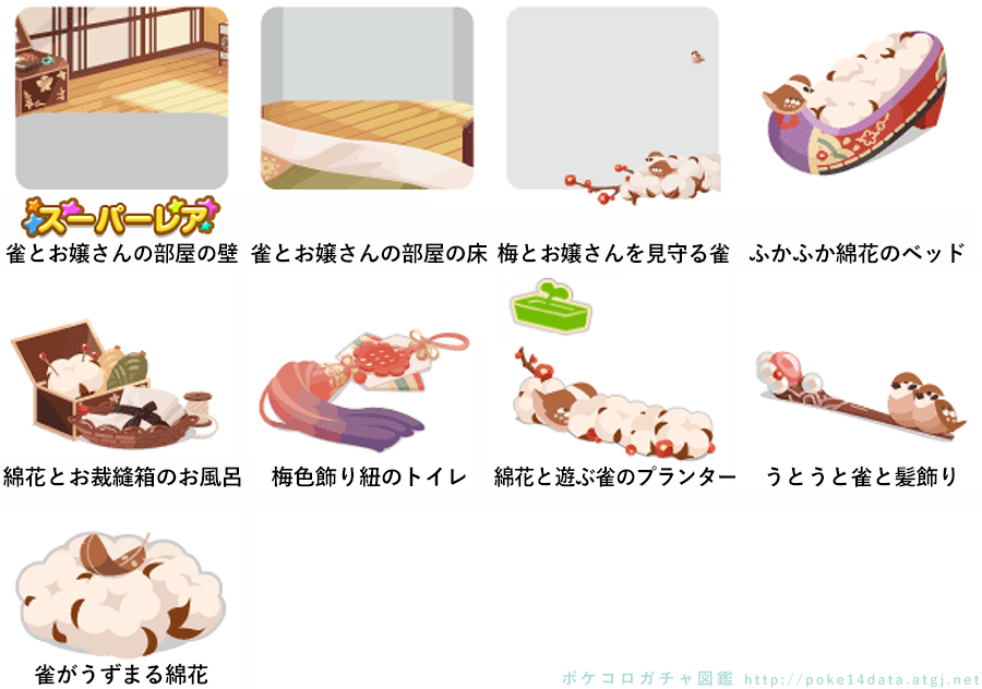 ★雀とお嬢さんの部屋の壁 雀とお嬢さんの部屋の床 梅とお嬢さんを見守る雀 ふかふか綿花のベッド 綿花とお裁縫箱のお風呂 梅色飾り紐のトイレ 綿花と遊ぶ雀のプランター うとうと雀と髪飾り 雀がうずまる綿花