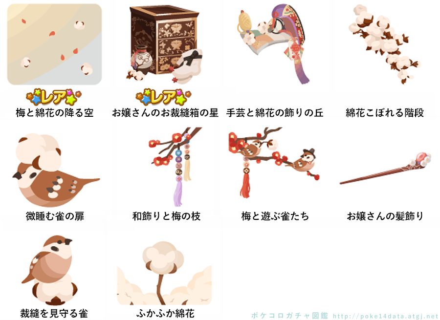 ☆梅と綿花の降る空 ☆お嬢さんのお裁縫箱の星 手芸と綿花の飾りの丘 綿花こぼれる階段 微睡む雀の扉 和飾りと梅の枝 梅と遊ぶ雀たち お嬢さんの髪飾り 裁縫を見守る雀 ふかふか綿花